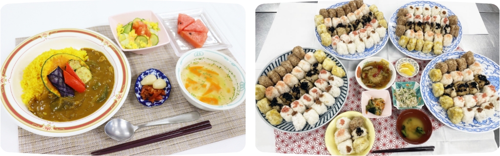 (左:夏野菜カレー 右:新米の時期に行うおにぎりバイキングイベント)