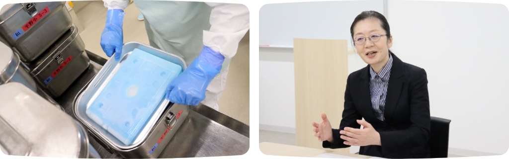 「受託当初から衛生管理のレベルは素晴らしかったのですが、運営を重ねる中で、使い捨て手袋の使用前後の破損チェックや、冷たい状態で提供する和え物の温度管理を、より強化していただくようになりました。和え物は調理や配送の過程で温度が上がりやすく、衛生面に細心の注意が必要なのですが、メフォスさんは繊細に管理していただいています。また、暑い夏に冷たい和え物が食べられることは、児童・生徒からもとても喜ばれています。」(伊東愛栄養教諭)
