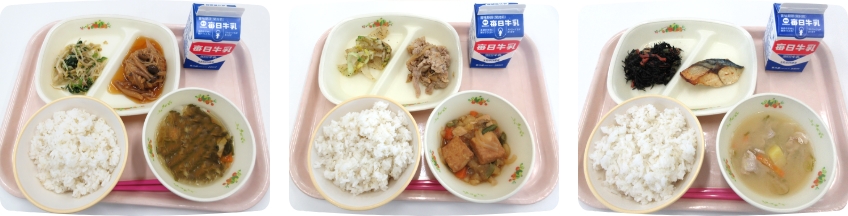 とある日の献立3種類(左:チキンハンバーグきのこあん、ほうれん草のごま和え、わかめのすまし汁、中央:豚肉の生姜焼き、白菜の赤しそ和え、厚揚げの炒め煮、右:さばの塩焼き、ひじきのうま煮、さつま汁)