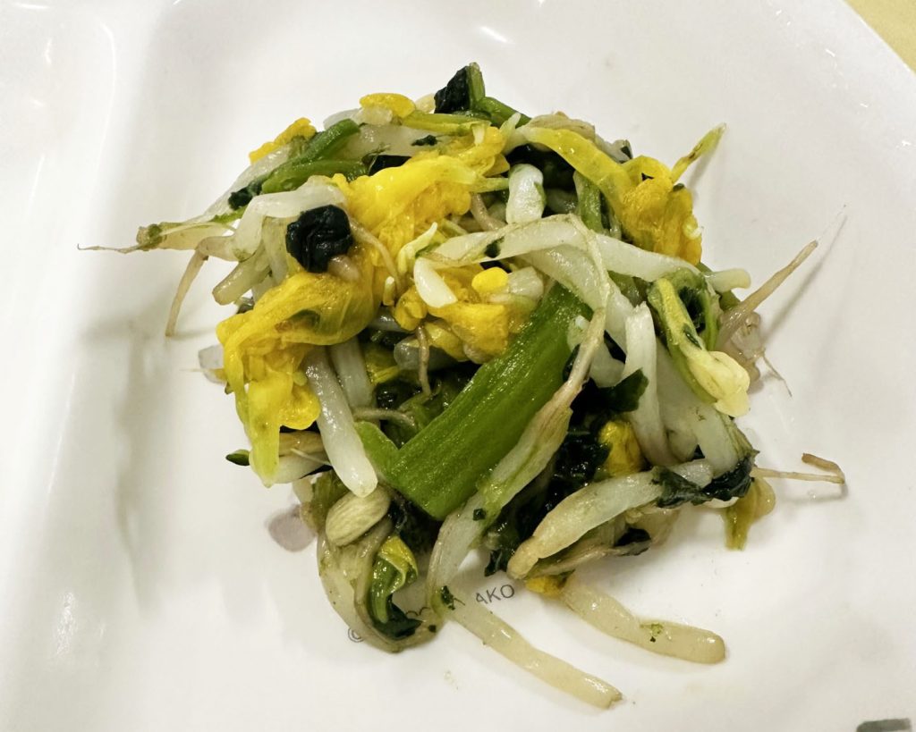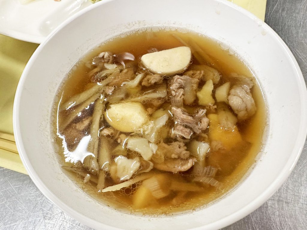 翌日の給食で提供した菊のおひたし(左)と芋煮(右)
