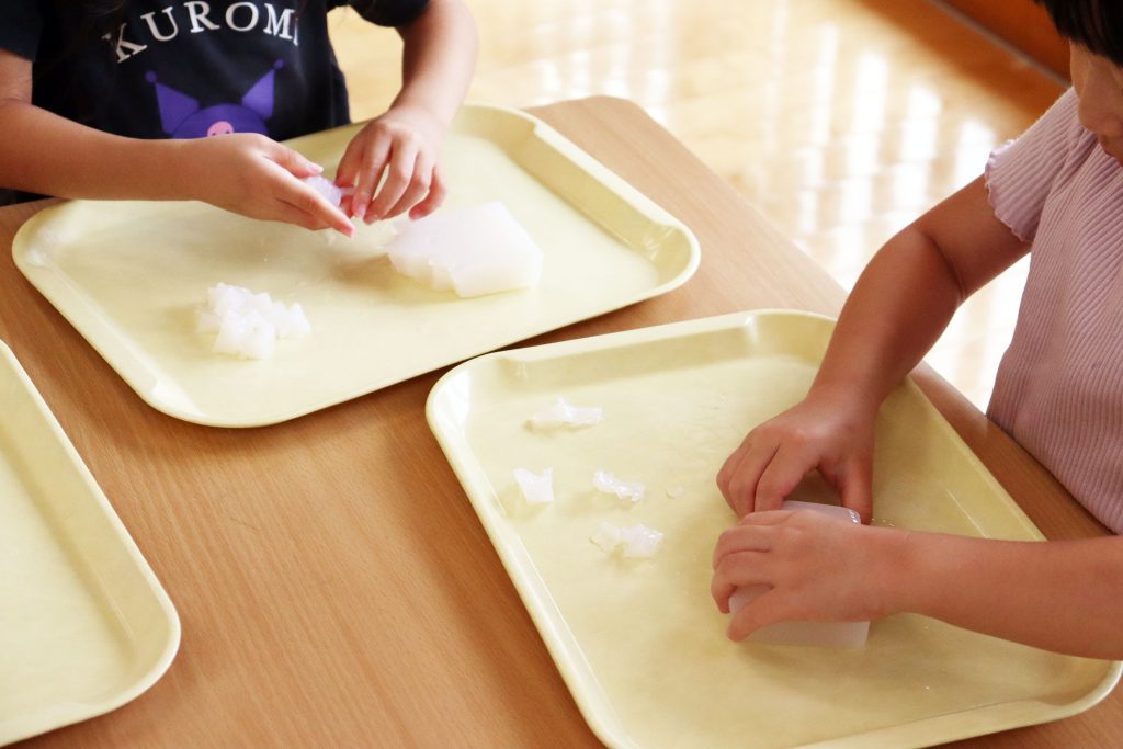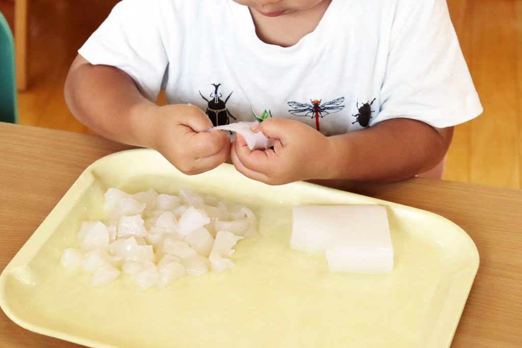 こんにゃくを担当するグループは、つるつるとしたこんにゃくに少し苦戦していましたが、「1,2歳の小さいお友達でも食べられるようにね!」との当社スタッフの声掛けのもと、一生懸命丁寧にちぎっていました。