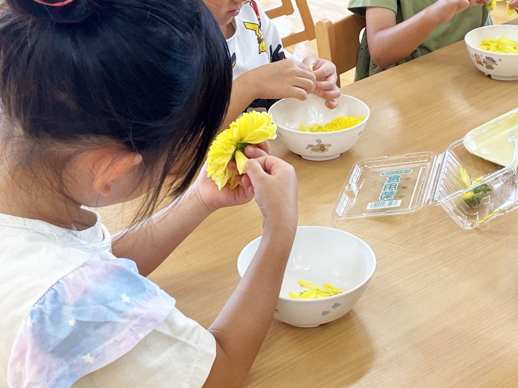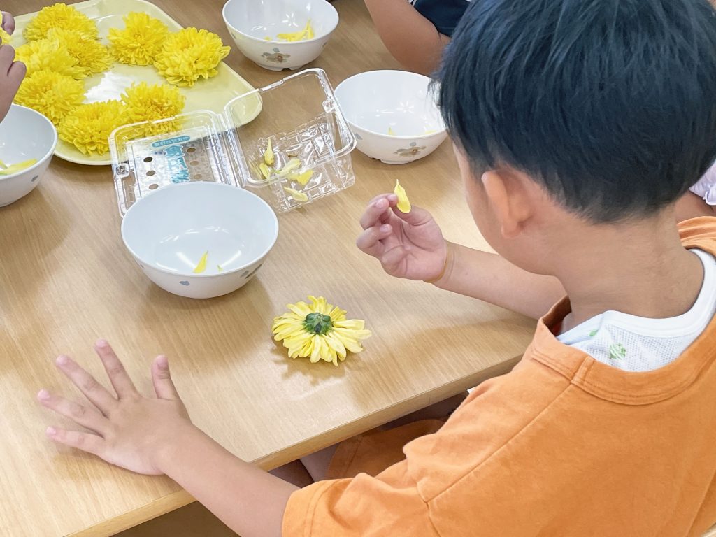 「花びらってこんなにいっぱいついてるんだ!」「菊ってどんなにおいかな?」と興味津々の子どもたち。