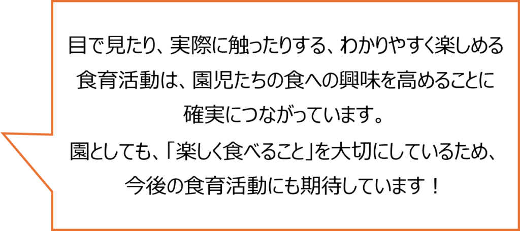 食材の形やにおい、手触りなどを実際に体験し、食への興味や関心を育んだ子どもたちにとって、いつも以上に楽しい食事の時間になったようです。