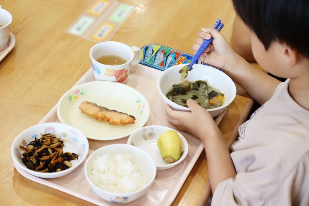 紙芝居の後は給食の時間で、物語にも登場したナスが入った味噌汁を提供。子どもたちは、「ナスだ!」と探しながら食べ進めます。