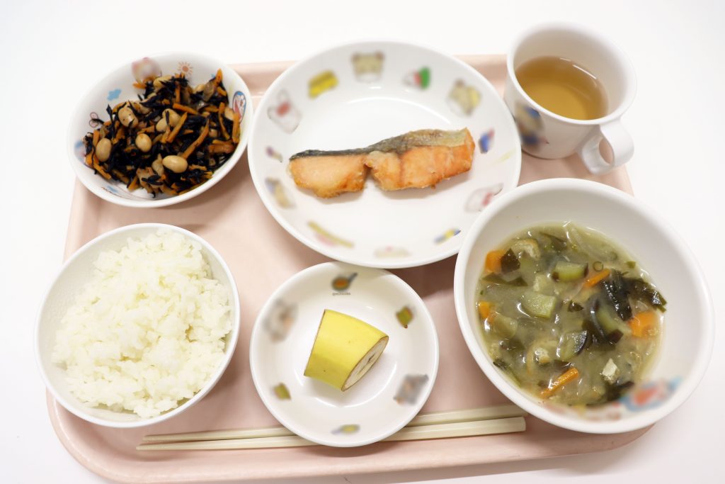 当日の献立:ごはん、ナスの味噌汁、鮭の竜田揚げ、ひじきの煮物、バナナ