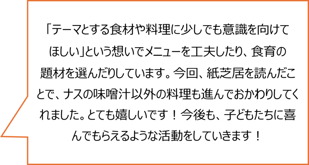 ナスが苦手な子どもも、紙芝居にこめた想いが届いたのか、この日はナスを残さず食べきりました!