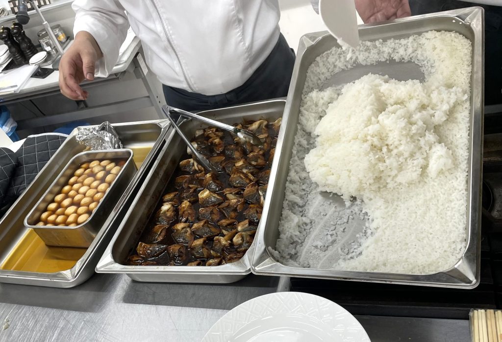 その後は、サバの味噌煮、里芋煮、春雨炒め、ピカタ、白米をグループで協力して調理!同時進行で複数の料理を効率的に調理する、集団給食の現場を体験してもらいました。
