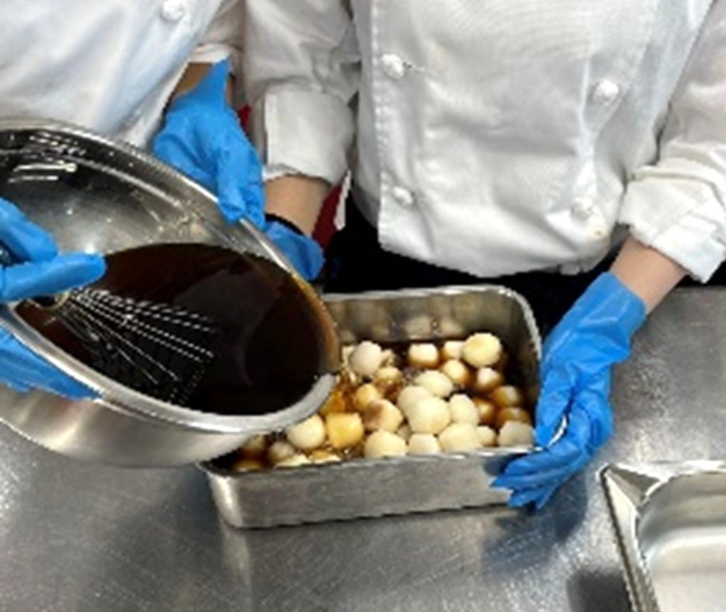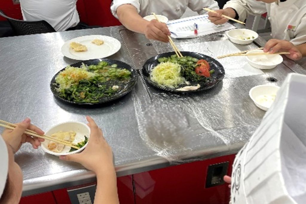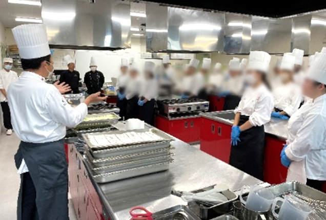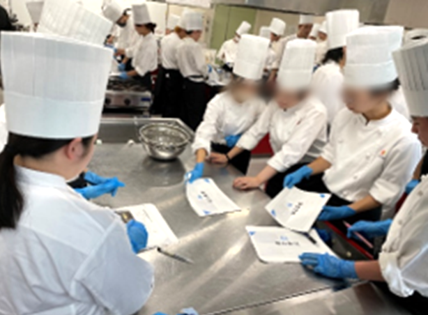 本授業に参加した学生からは、「丁寧に教えていただき、楽しみながら調理できた」「集団給食の現場をイメージできた」などの感想をいただき、調理師の仕事や集団給食の調理について理解を深めていただく機会となりました。
