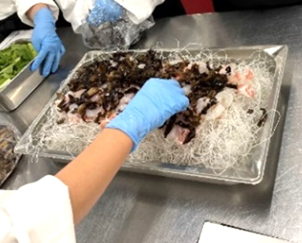 ↑グループ内で役割分担、加熱用の調理トレーに食材を入れ、調味していきます