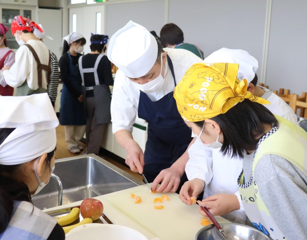 児童たちはフルーツを切る際、包丁の使い方に苦戦する様子もみられましたが、シェフと楽しみながら調理したことで、料理への関心が高まった様子でした。