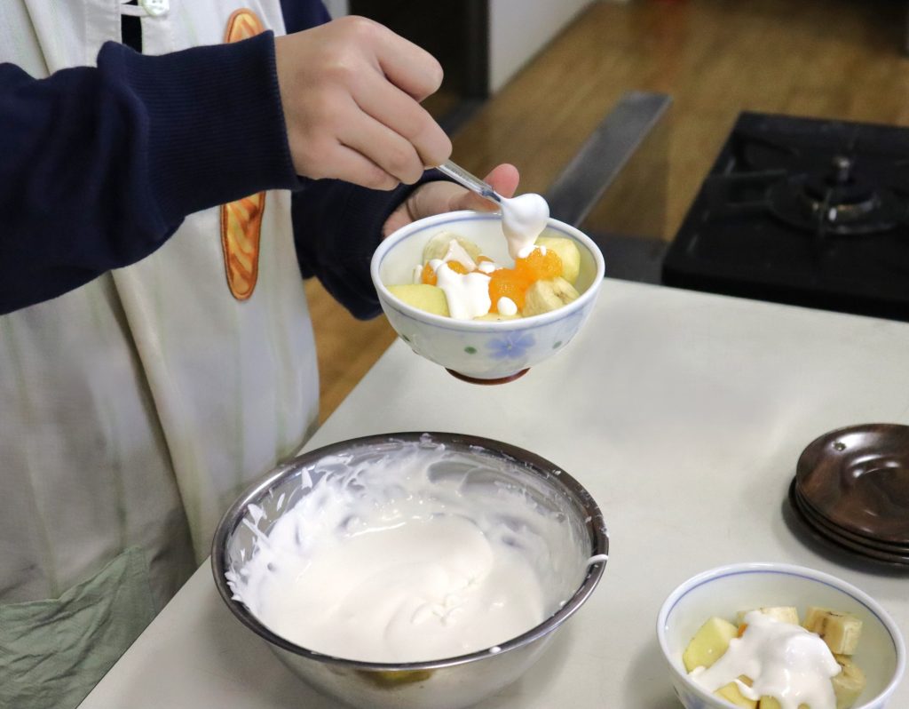 米粉あんなどを豆乳ヨーグルトに加えて混ぜ、和のテイストを入れた特製ヨーグルトを作り、カットしたフルーツにかけて!最後に全員で試食しました。