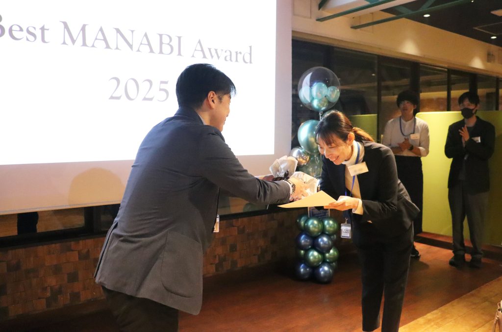 昨年12月、積極的に動画研修を活用して自己成長に努めた従業員を表彰する「マナビパーソンデー」を開催。多くの従業員が「わたしアカデミー」を活用している中、今回は19名のグループ内従業員が参加し、表彰されました。