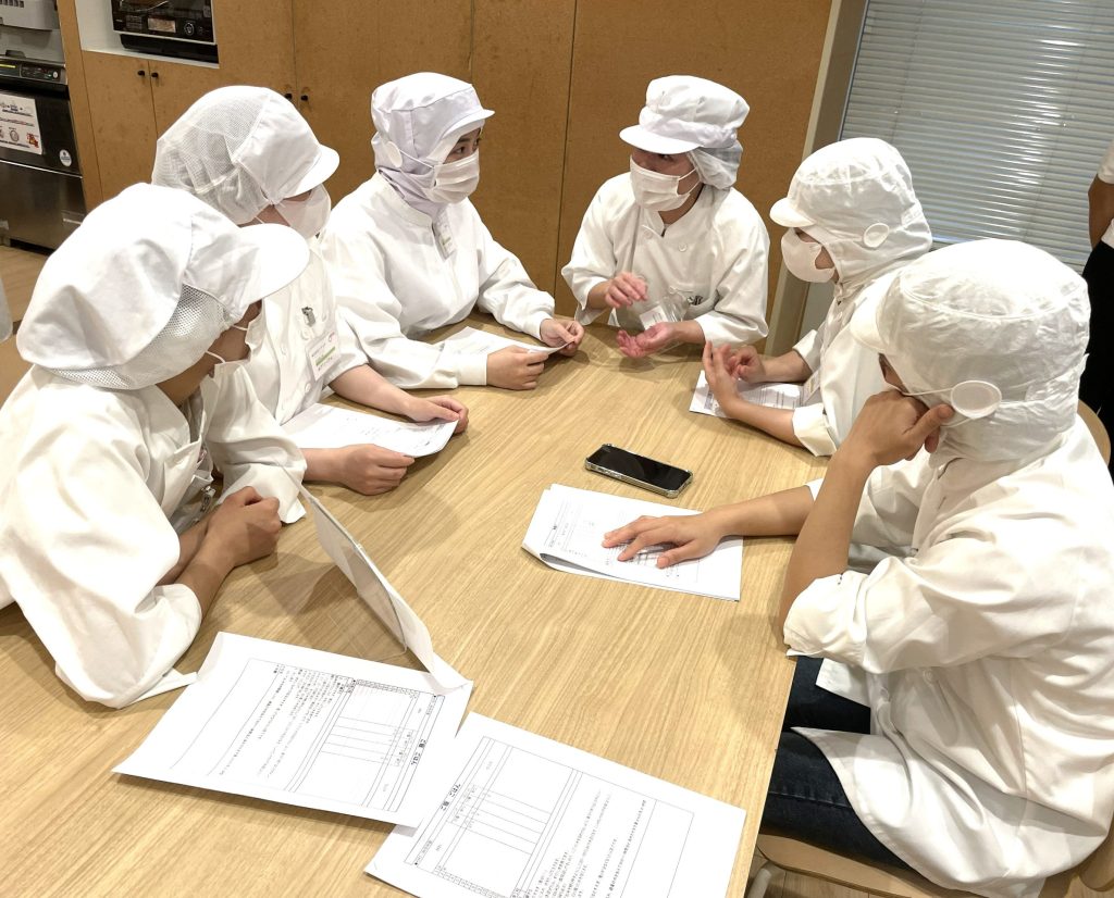 また、集団給食の基本である衛生管理についても、中心温度計の使い方や温度記録表への記載の仕方などの指導が行われました。