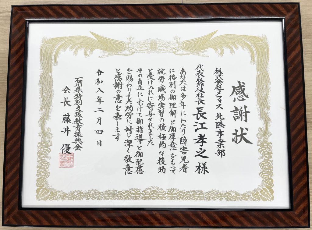 この度、障がい者の就職や職場体験実習の受け入れを積極的に実施している当社北陸事業部の実績が評価され、石川県特別支援教育振興会様より感謝状をいただきました。