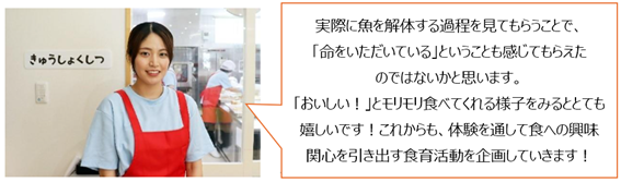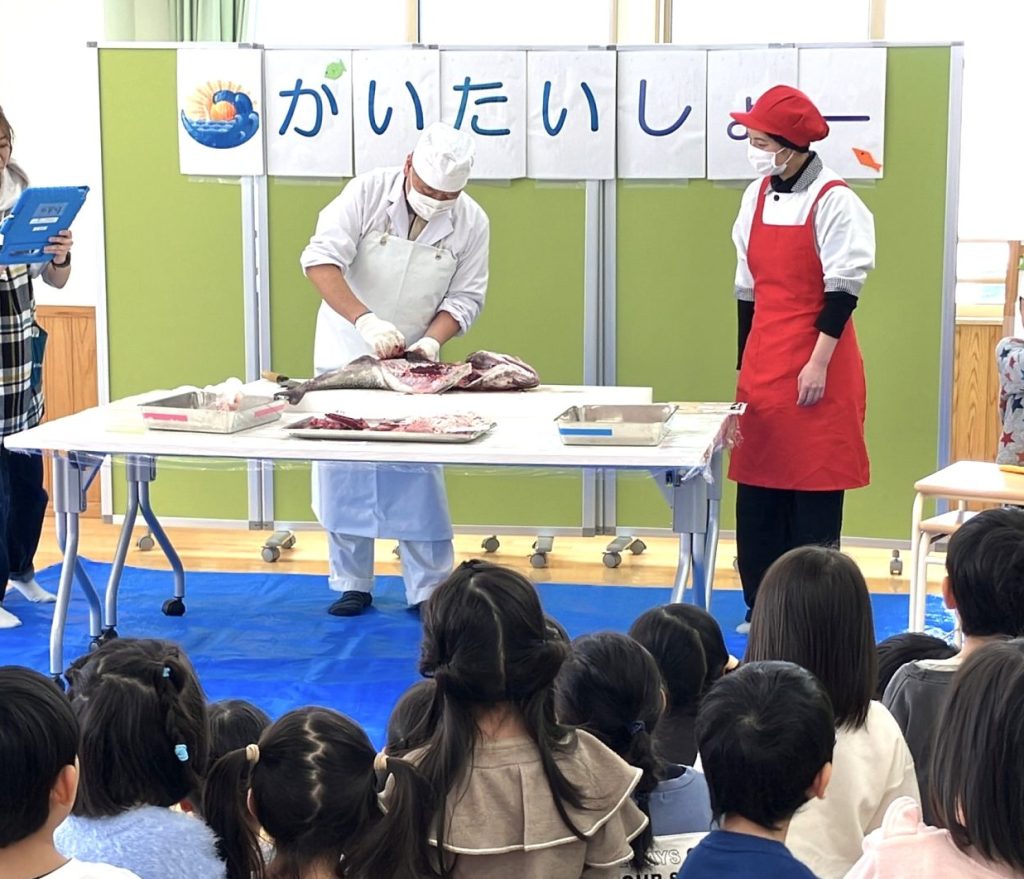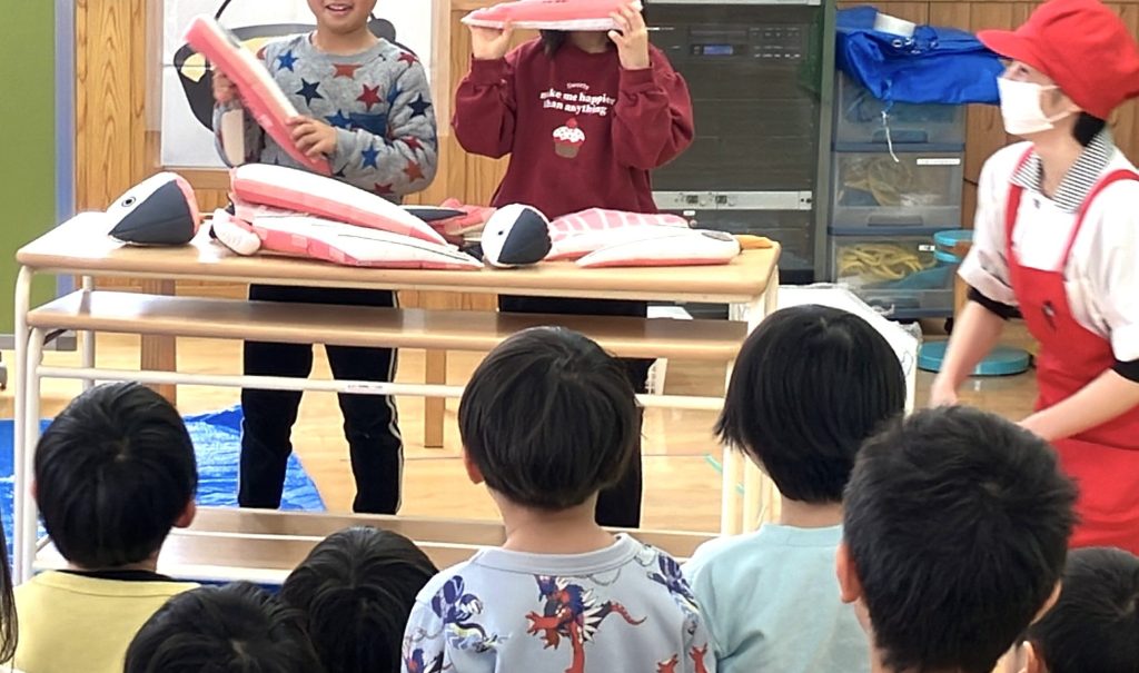 その後の質疑応答では、子どもたちから「どうやってお魚を切っているの?」「お魚はどこから来たの?」「今日のお魚はイカより大きい?」など、次々と質問が飛び、子どもたちの素直な好奇心があふれる時間となりました。