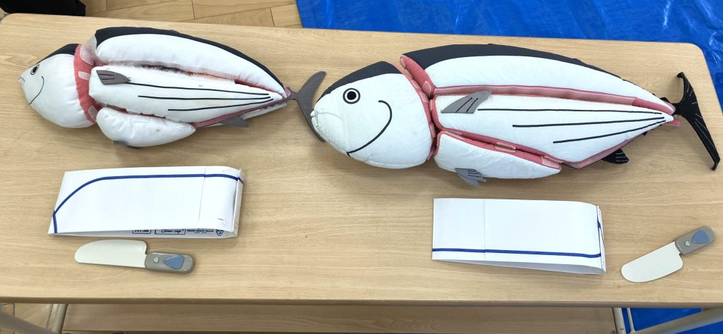 代表の園児2名には「ミニ板前」として、カツオのぬいぐるみを使った解体の模擬体験に挑戦してもらいました!少し緊張しながらも一生懸命取り組む姿に、会場は自然と和やかな雰囲気に。