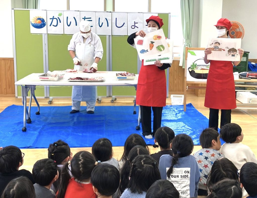 さらに解体中には、食べ物を大切に食べる気持ちを育む、当社オリジナルの紙芝居も実施。子どもたちは質問に元気よく手を挙げて答え、「命をいただいて食事をしている」ことを伝える場面では静かに耳を傾けるなど、楽しみながらも真剣に学んでいる様子でした。