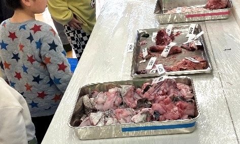 解体後は、部位ごとに分けた寒ダラを間近で観察!子どもたちからは、「なんか臭い!」「脳が小さい!」「えらってなに?」など、さまざまな声があがり、魚の体のつくりや特徴への理解を深める機会となりました。