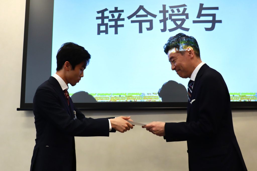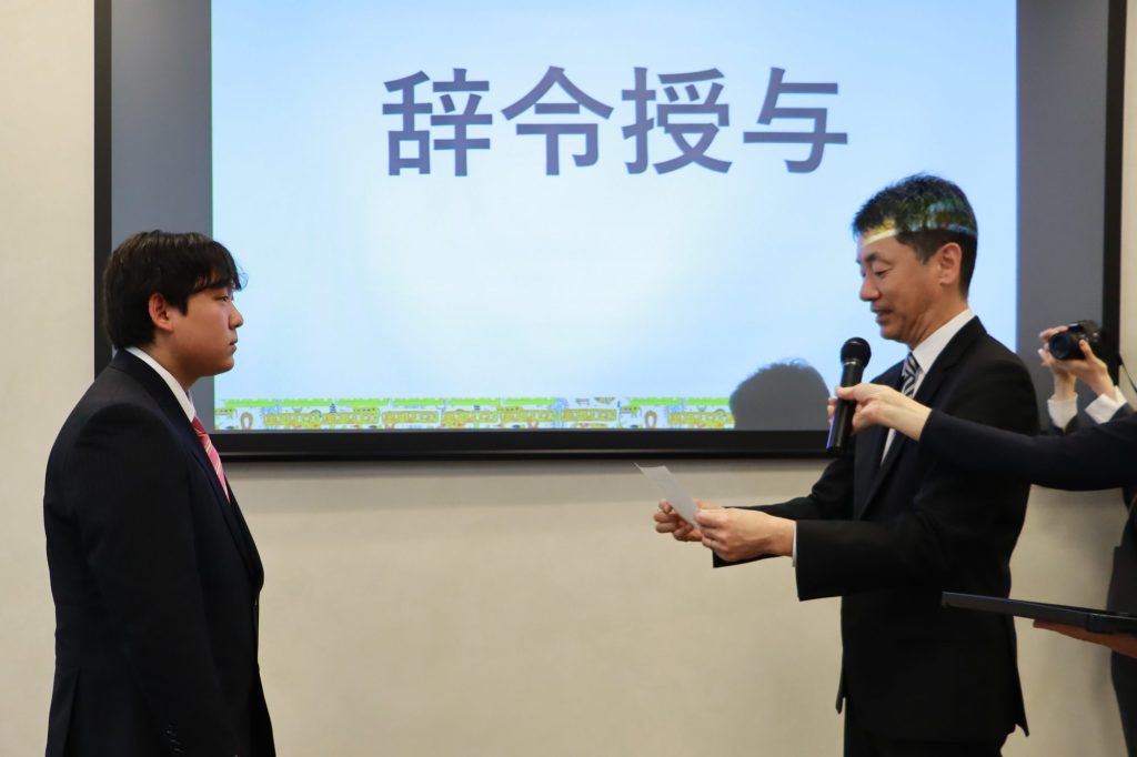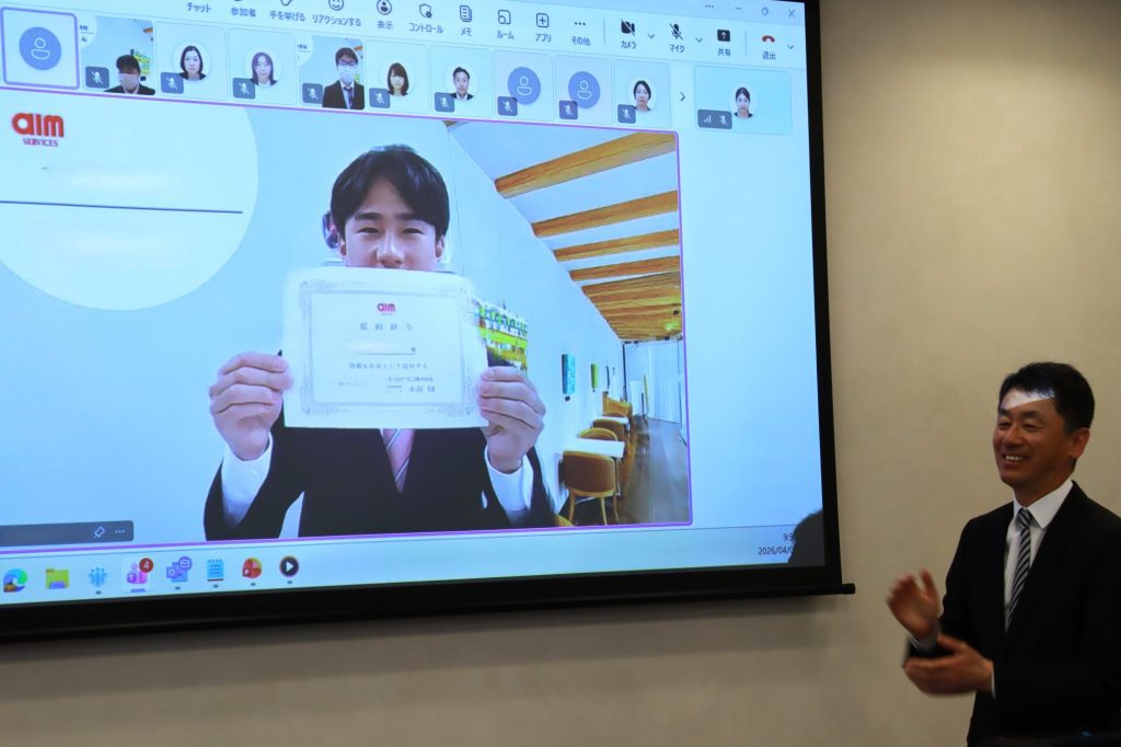 続いて行われた辞令授与では、新入社員一人ひとりの名前が呼ばれ、会場参加・オンライン参加を問わず、それぞれの新しい門出が祝福されました。