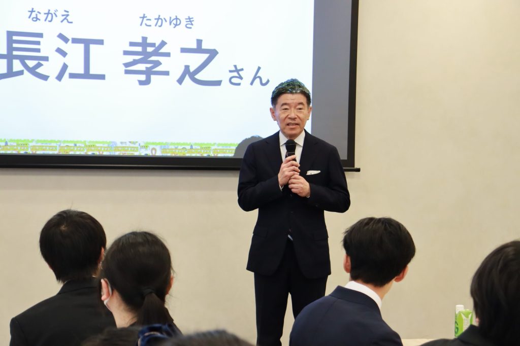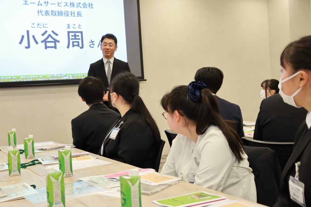 式典では、株式会社メフォス 代表取締役社長 長江 孝之ならびに、エームサービス株式会社 代表取締役社長 小谷 周より、新入社員へ向けた祝辞が贈られました。