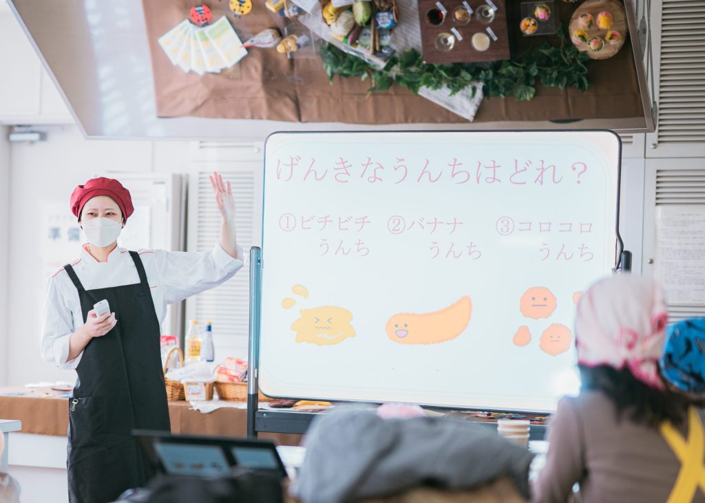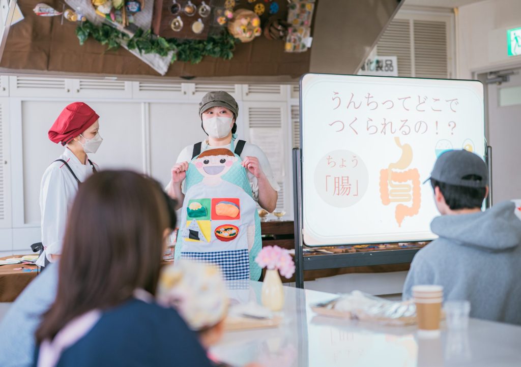 前回に引き続き、アスト社と協働で開催し、当社がイベントをプロデュース。今回は、食育エプロンを用いて、食べたご飯が体の中でどのように消化されて「うんち」になるのかを、子どもたちと一緒に考えるプログラムを実施しました。