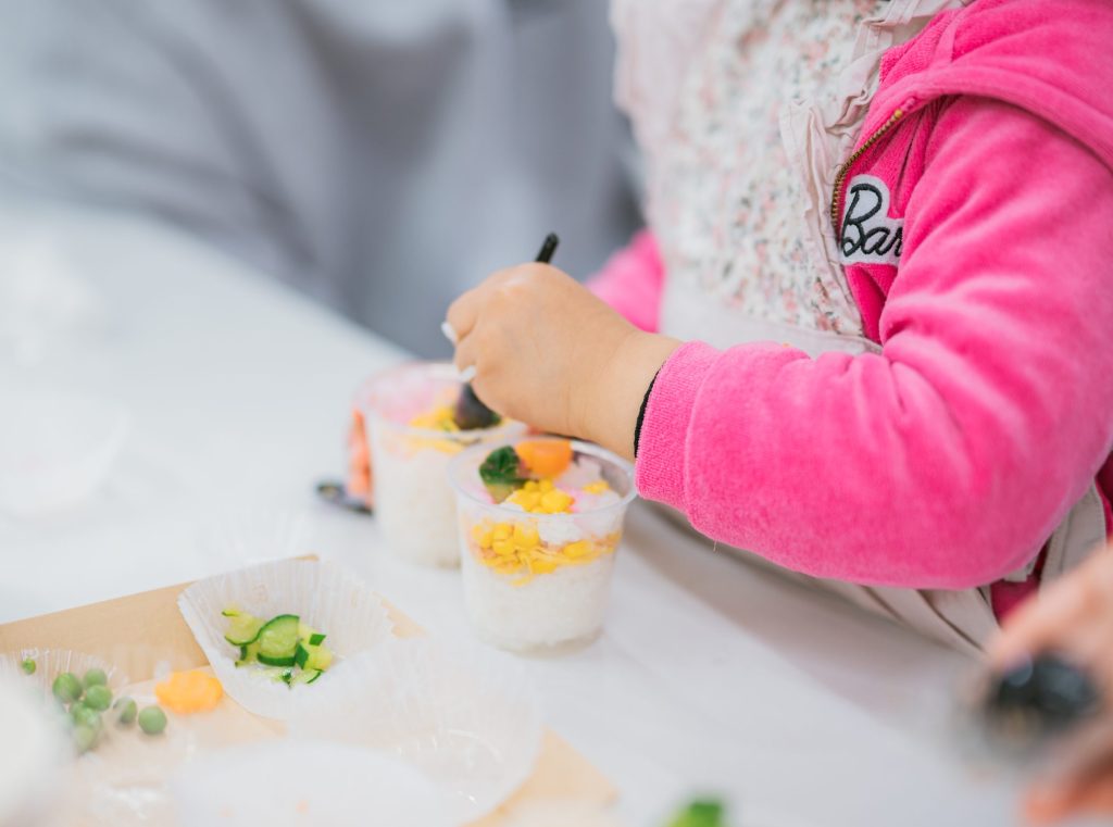 また、消化を助ける働きがあるとされる塩麴やヨーグルトを使用した、ちらし寿司作りも開催し、子どもたちが楽しみながら調理体験できるようにサポートしました。