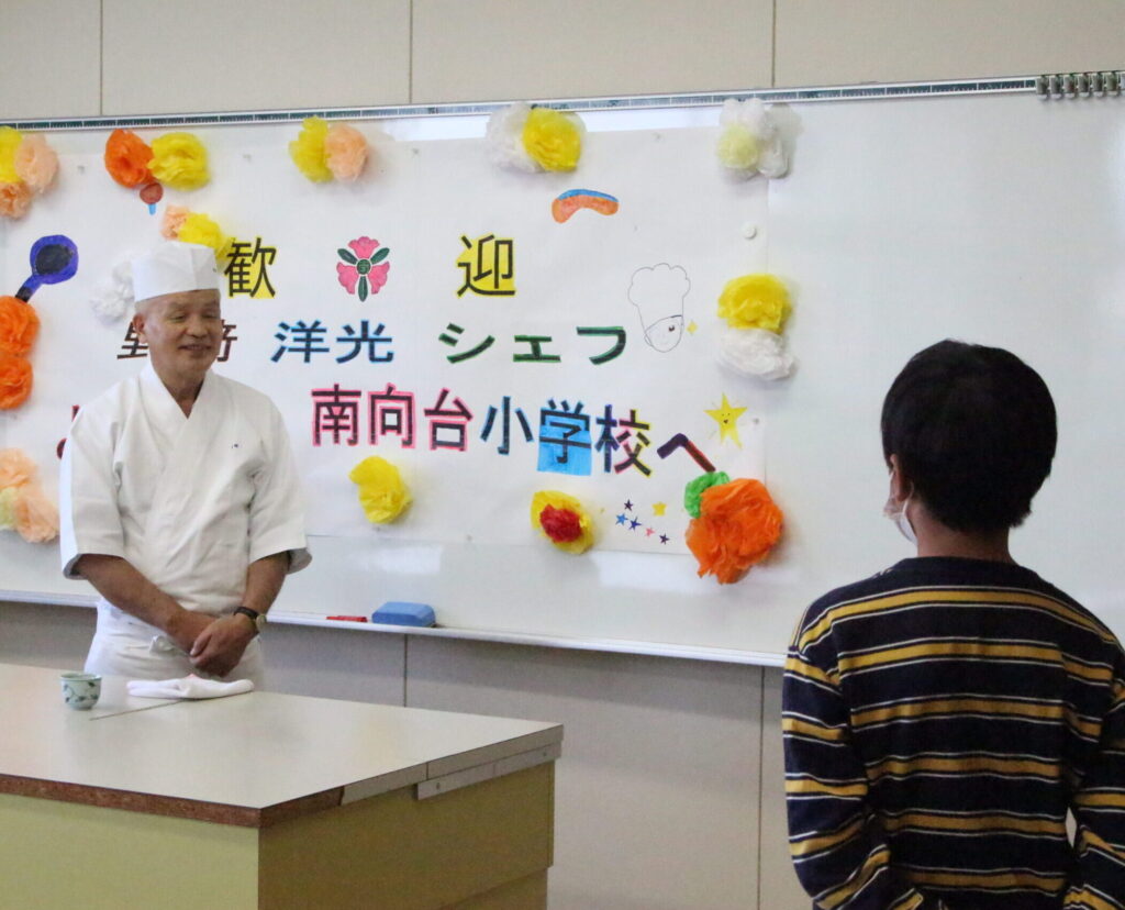 児童からは「料理で大切にしていることは?」「食材の選び方は?」「今まで困難なことがあったときどのように乗り越えたか?」などの質問があがり、シェフからは、50年間にわたる料理人としての経験から、「困難なことがあってもプラスに考えて行動することが大事」という思いが伝えられ、児童たちはメモをとりながら真剣な表情で耳を傾けていました。